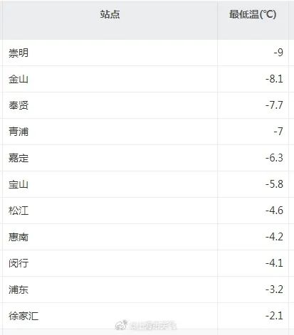 今天整個上海凍到發紫,市區徐家彙站最低氣温零下2.6℃,多個郊區打破建站以來同期日最低氣温值紀錄,崇明站零下9℃、金山站零下8.5℃、青浦站零下7.8℃、奉賢站零下7.7℃、寶山站零下5.8℃。