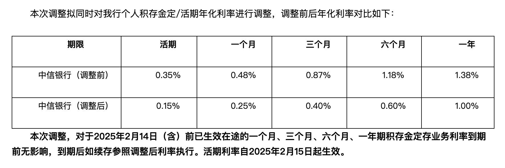此前,中信銀行發佈公告稱,將於2月15日對個人積存金定、活期利率進行調整。調整後,活期、一個月、三個月、六個月、一年年化利率分別為0.15%、0.25%、0.4%、0.6%、1%。中信銀行表示,此次調整,對於2025年2月14日(含)前已生效在途的一個月、三個月、六個月、一年期積存金定存業務利率到期前無影響,到期後如續存參照調整後利率執行。活期利率自2025年2月15日起生效。