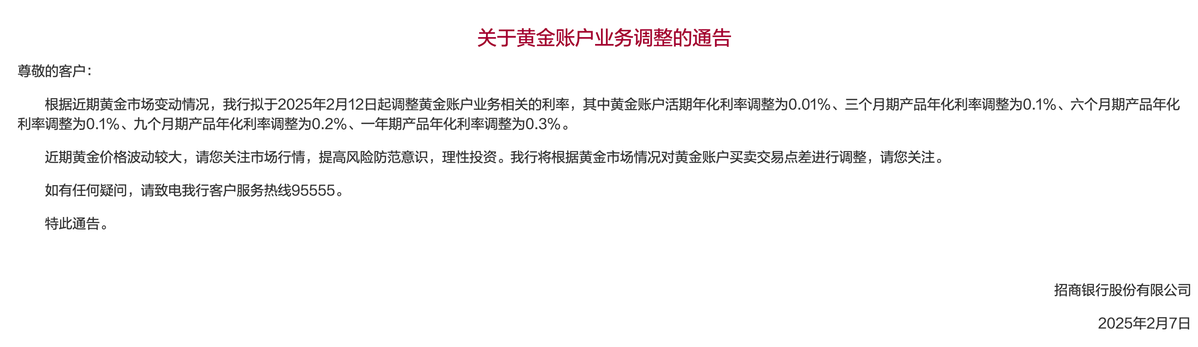 【環球網金融綜合報道】近日,招商銀行發佈通告,宣佈將於2月12日起對黃金賬户業務相關的利率進行調整。調整後,黃金賬户活期年化利率將降至0.01%,三個月期及六個月期產品年化利率均調整為0.1%,九個月期產品年化利率為0.2%,一年期產品年化利率則為0.3%。