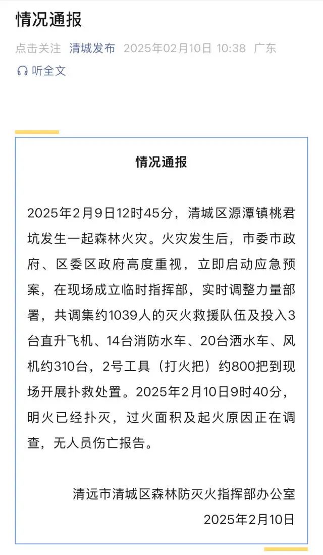 2025年2月9日12時45分,清城區源潭鎮桃君坑發生一起森林火災。火災發生後,市委市政府、區委區政府高度重視,立即啓動應急預案,在現場成立臨時指揮部,即時調整力量部署,共調集約1039人的滅火救援隊伍及投入3台直升飛機、14台消防水車、20台灑水車、風機約310台,2號工具(打火把)約800把到現場開展撲救處置。2025年2月10日9時40分,明火已經撲滅,過火面積及起火原因正在調查,無人員傷亡報告。