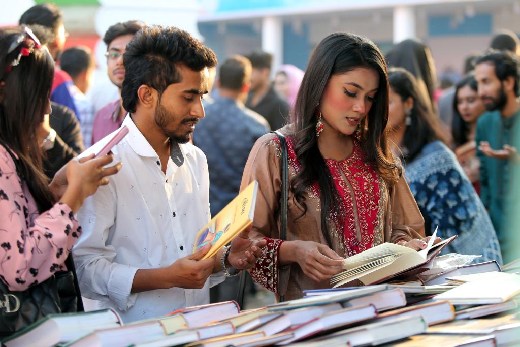 2月7日,在孟加拉國首都達卡舉行的“二月書展”上,人們閲覽書籍。新華社發(哈比卜·拉赫曼攝)