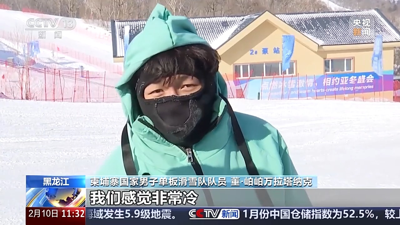 *柬埔寨國家男子單板滑雪隊隊員 董·岶岶萬拉塔納克:*適應比賽的環境確實不容易,今天零下20℃,我們感覺非常冷,手已經凍僵了。