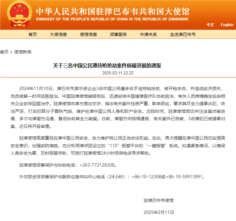 2024年11月10日,津巴布韋某中資企業3名中國公民遭多名歹徒持槍搶劫,被開槍擊傷,並造成經濟損失,傷員被第一時間送醫救治。中國駐津使館接報告後,迅速安排中國援津醫療隊協助救治,有關人員病情穩定後由相關企業安排回國治療。駐津使館向津方提出交涉,指出有關案件性質嚴重、影響惡劣,要求其盡全力緝拿兇犯、依法嚴懲,打擊犯罪分子囂張氣焰,維護在津中國公民人身和財產安全。近段時間,駐津使館密切關注該案偵破進展,多次與津警方溝通,督促協助其全力破案。日前,津警方向我館通報,有關案件已告破,3名嫌犯已被緝拿歸案,近日將開庭審理。