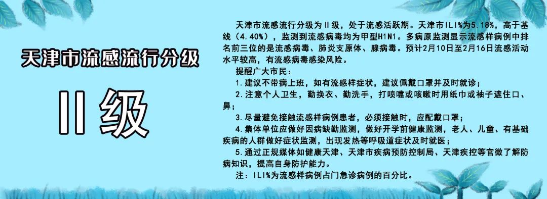 今日,“健康天津”微信公眾號發佈最新一期流感分級預警週報,天津市流感流行分級為Ⅱ級,處於流感活躍期。