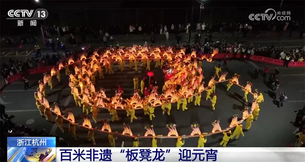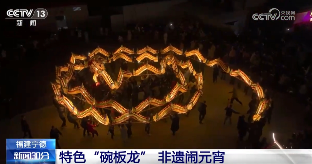 從正月十三開始,福建寧德特色非遺“碗板龍”拉開鬧元宵的序幕。晚上6點多,在碗窯村鑼鼓聲、禮花、鞭炮聲 和眾人的歡呼聲中,一條百米長龍沿着村道蜿蜒遊走。其中,“團龍”是碗板龍的壓軸大戲,龍身盤繞成螺旋狀,頭尾呼應,寓意着圓滿團圓。
