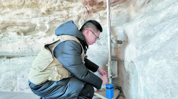 “這個窟的東南角岩石較為脆弱,需要重點檢查。”仔細查看可能存在隱患的點位,掃掉監測儀器表面的落雪,重新安置垂墜的零件……申杲熟練地對窟內環境與儀器狀態進行檢查與調整。在更換完3號窟內監測儀器的電池後,申杲結束了巡查工作。