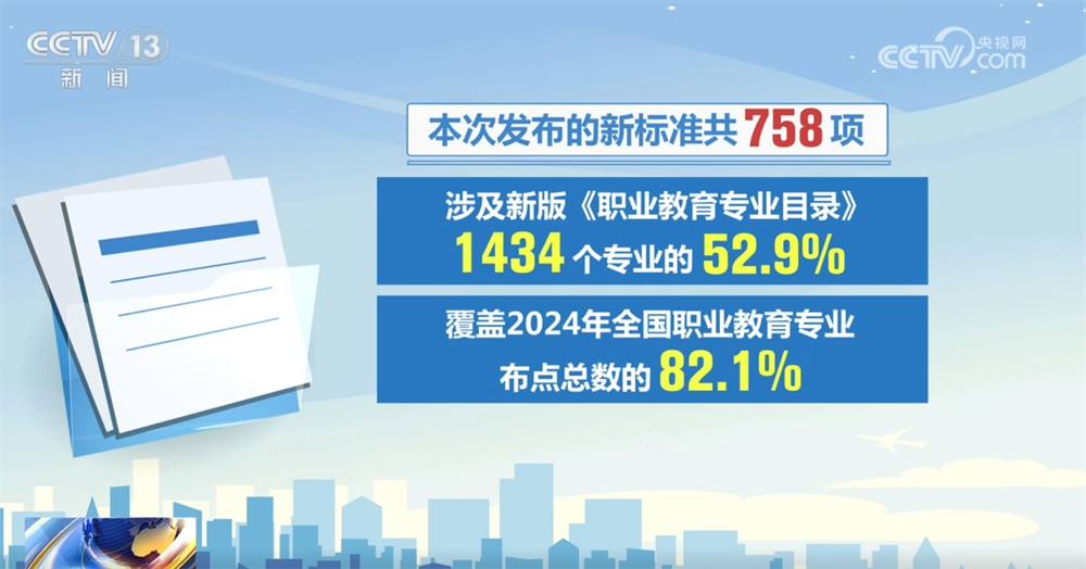 本次發佈的新標準共758項,涉及新版《目錄》1434個專業的52.9%,覆蓋2024年全國職業教育專業布點總數的82.1%。