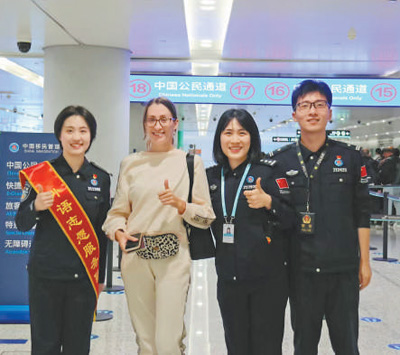 外國遊客在杭州蕭山國際機場國際服務中心,為便捷的入境服務“點贊”。