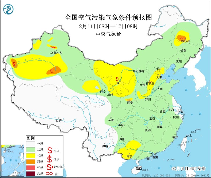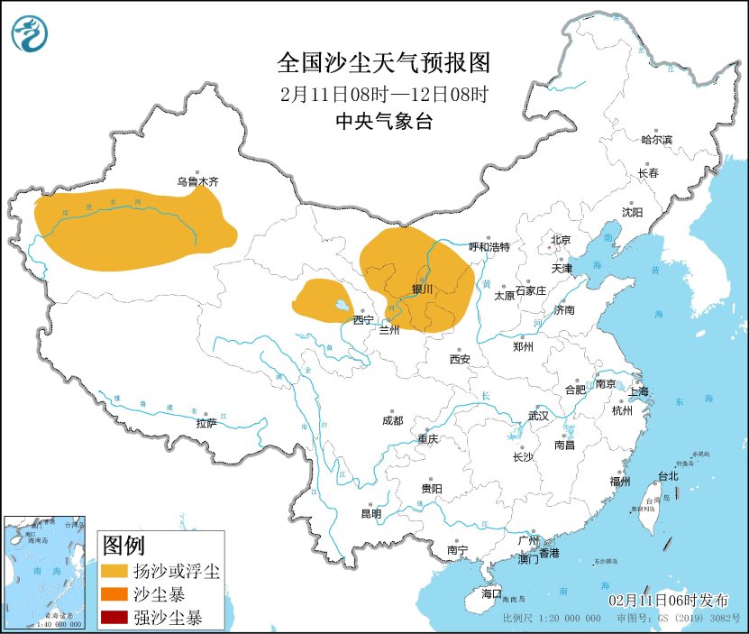 11日,新疆南部、青海北部、甘肅北部、內蒙古西部、寧夏、陝西北部等地的部分地區有揚沙或浮塵天氣。