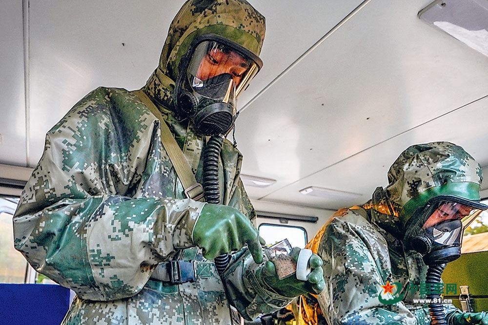 防化分隊緊急出動。抵達目標區域後,觀測組開設化學觀測哨,採集氣象數據;偵察組穿戴防護裝具,對“染毒”區域進行偵檢和取樣,並標記邊界。不久,樣品被送到野戰化驗室,化驗組快速進行檢測。隨後,洗消組調製洗消液,對“染毒”地域展開洗消作業。