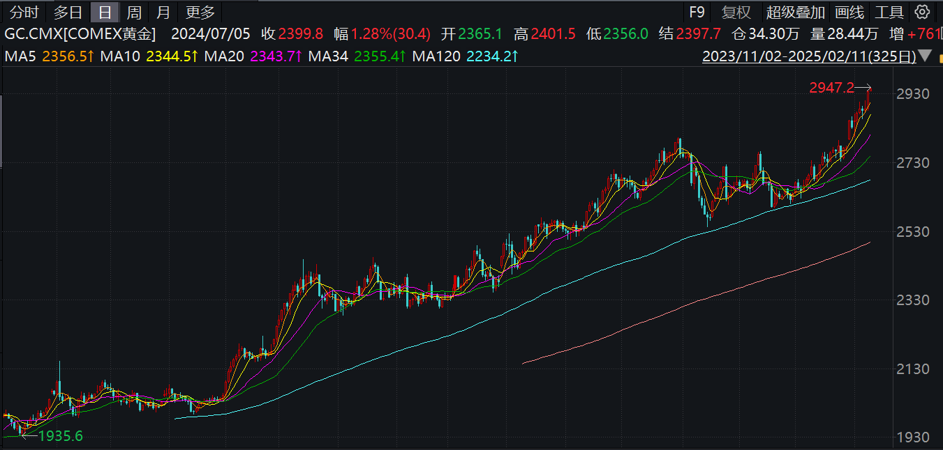 【環球網財經綜合報道】北京時間2月11日凌晨,國際貴金屬期貨普遍收漲,COMEX黃金期貨漲1.7%報2936.8美元/盎司,COMEX白銀期貨漲0.16%報32.495美元/盎司。進入到2025年以來,黃金價格屢創新高,延續了去年的強勁漲勢,且期間未出現明顯回調;2025年初至今漲幅達 10%。