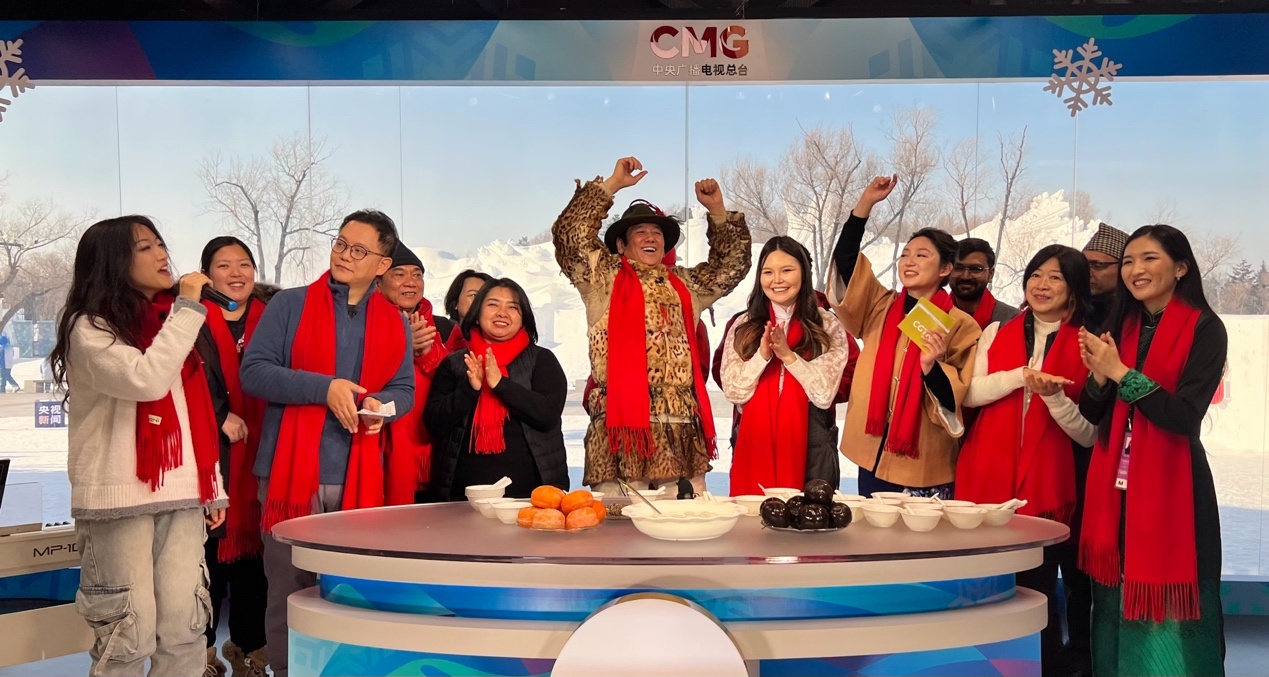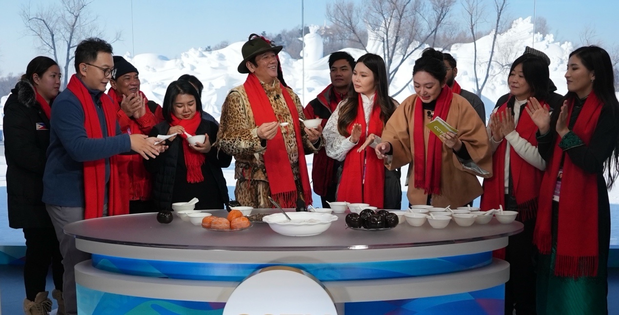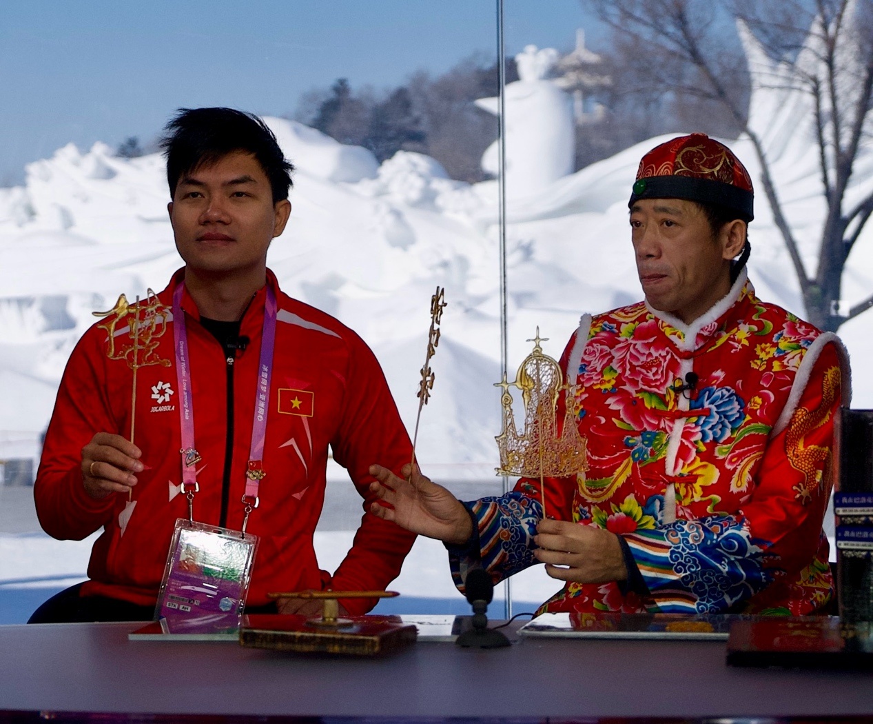 來自蒙古國、泰國、菲律賓、越南、印度、尼泊爾等國的近20位運動員、體育代表團官員和媒體人,在賽場上比拼之後,歡聚在哈爾濱太陽島雪博會中央廣播電視總枱的演播室,在冰天雪地中共慶新春。