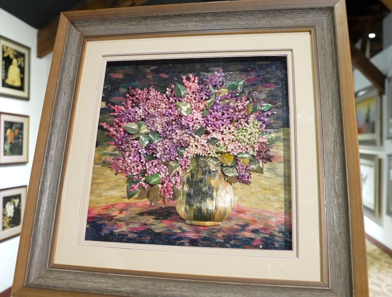 麥秸畫是以生長在東北黑土地上的麥稈為原料,利用其自然光澤、紋理和質感,經過選料、泡、煮、染、刮等十幾道手工製作工序,將花卉、風景、建築、人物、動物等生動形象地表現出來。