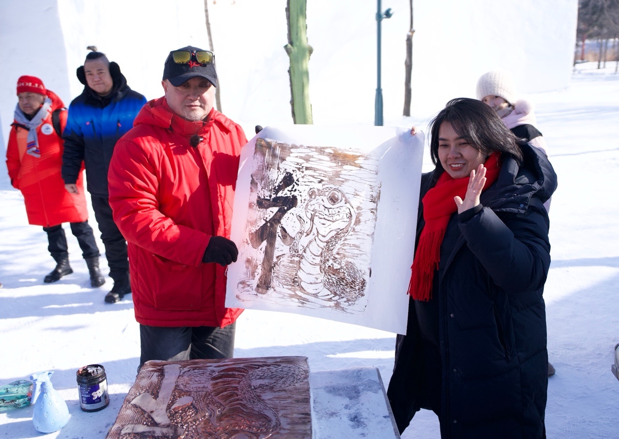 泰國駐華大使館二等秘書王安安在黑龍江省藝術研究院冰版畫研究院副院長盛琰的指導下,製作出冰版畫《畫蛇添福》,用蛇的形狀和漢字的偏旁部首組合雕刻出漢字“福”並拓印出來,寄託對中國農曆蛇年的祝福。
