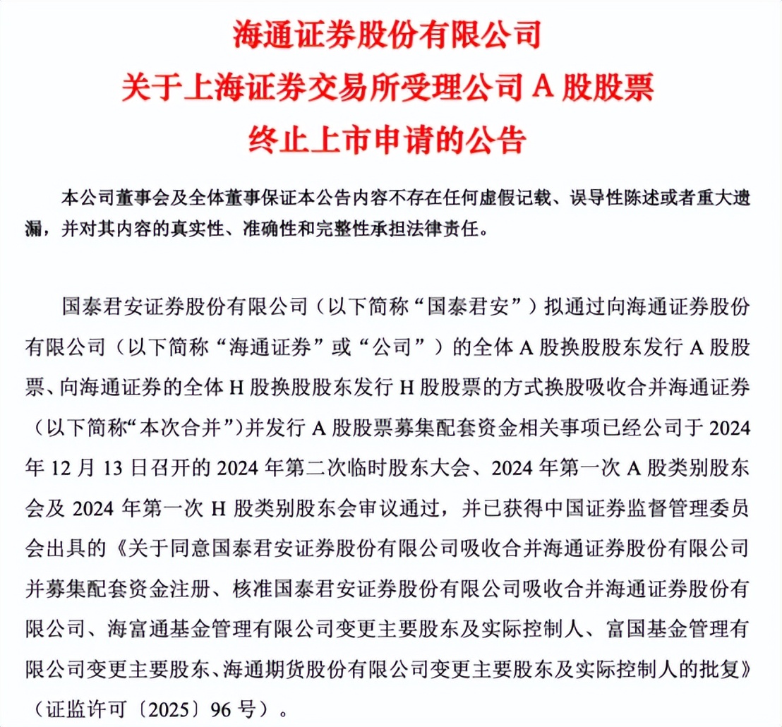 此前,國泰君安吸收合併海通證券併發行A股股票募集配套資金的事項已獲證監會批覆同意。合併方案規定,自交割日起,國泰君安將承繼及承接海通證券的全部資產、負債、業務、人員等,合併完成後,海通證券將終止上市並註銷法人資格。