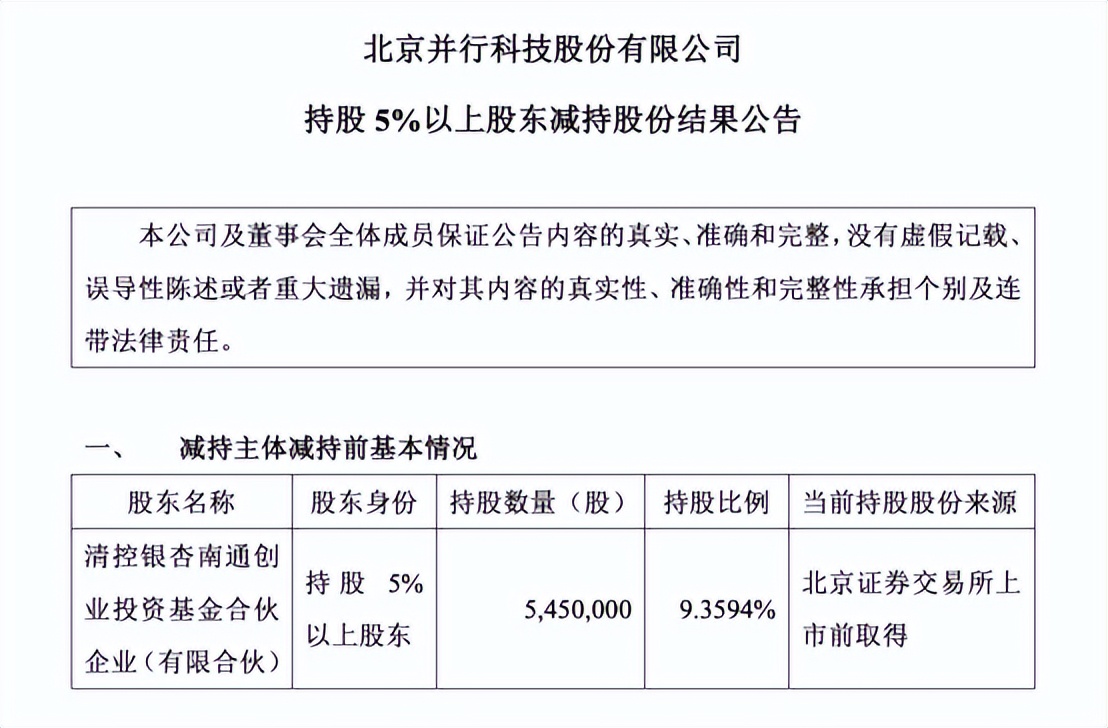 2月11日晚,並行科技發佈公告,持股5%以上的股東清控銀杏南通創業投資基金合夥企業(簡稱“清控銀杏”)已完成其減持計劃。根據公告,清控銀杏在近期內大幅減持了並行科技的股份。