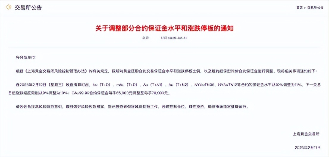 根據上金所發佈的《關於調整部分合約保證金水平和漲跌停板的通知》,自2025年2月12日(星期三)收盤清算時起,多個黃金延期合約的保證金水平將從10%上調至11%,同時下一交易日起漲跌幅度限制也從9%調整為10%。此外,CAu99.99合約的保證金也進行了相應調整。