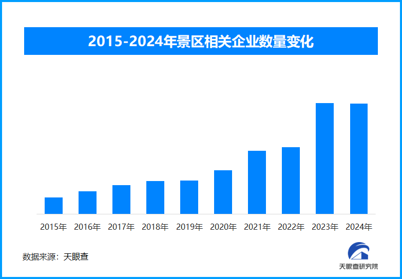 天眼查專業版數據顯示,截至目前我國現存在業、存續狀態的景區相關企業超46.1萬家。其中,2024年截至目前新增註冊相關企業約8.5萬餘家,從企業註冊數量趨勢來看,近十年間,景區相關企業的註冊數量大體呈現出增長態勢,並在2023年達到頂峯,為超8.6萬餘家。