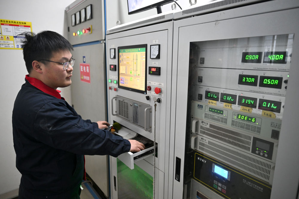 1月8日,在河南省科學院(沁陽)科創園,焦作同輻科技有限責任公司工作人員查看電子加速器系統運行狀態。新華社記者 李嘉南 攝