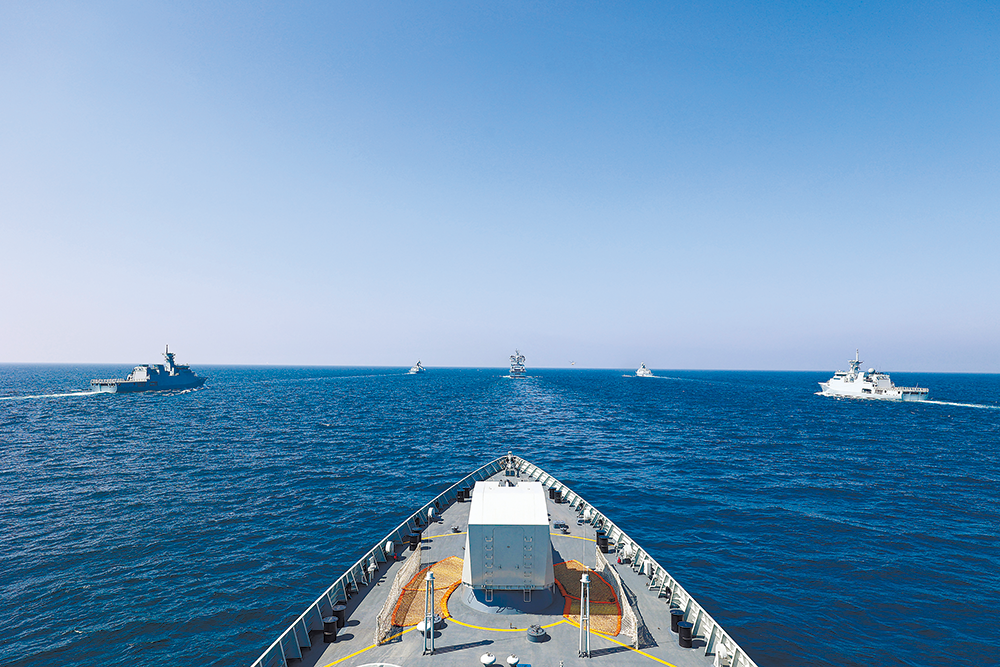 “和平-2025”多國海上聯合演習期間,中外參演艦艇向實兵演習海域航渡。