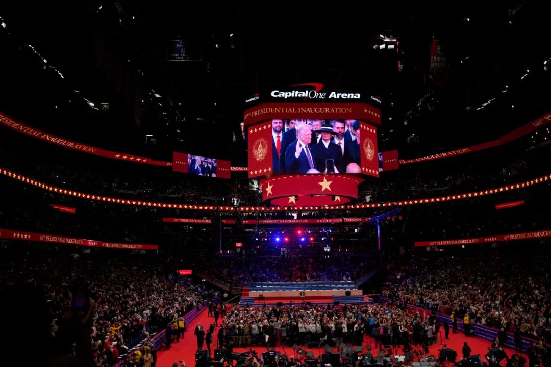 1月20日,在美國首都華盛頓第一資本體育館,人們觀看美國第47任總統就職典禮的轉播。新華社記者 吳曉凌 攝