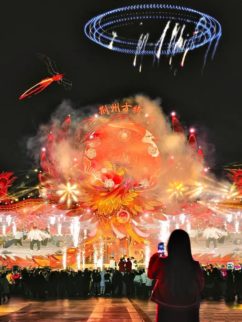 (荊州方特景區隆重上演九州民俗節活動,火龍火壺、非遺百戲、星河龍燈秀、千燈巡遊、冰雪嘉年華等活動開啓沉浸式民俗盛宴。圖源|湖北文旅公眾號)