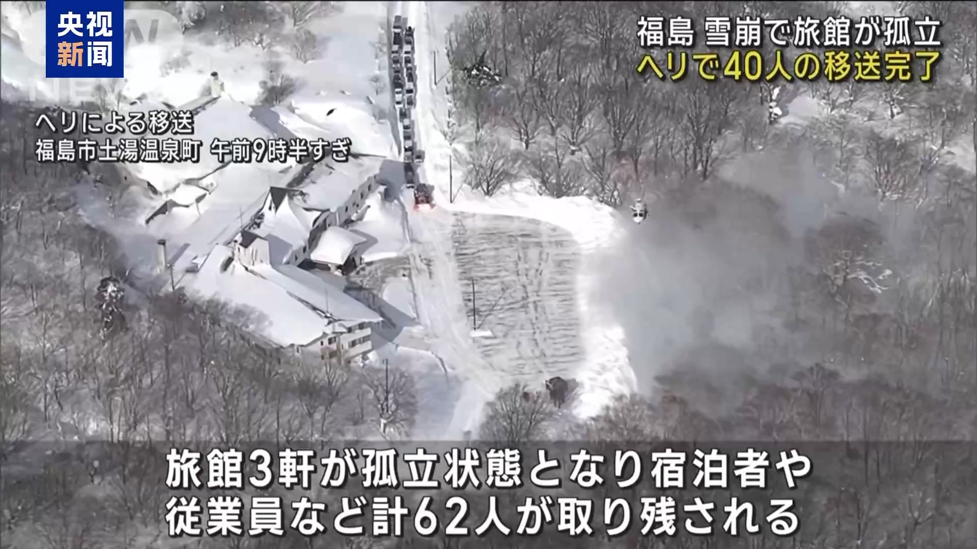 另一方面,在福島縣的土湯温泉町,10日,連日暴雪引發雪崩,當地位於山中的三家旅館通往外部的公路被阻塞,旅客和工作人員共計62人被困。12日,當地警方調遣直升機,將其中40人運送下山。當地政府計劃使用無人機對現場進行調查後,展開除雪作業。