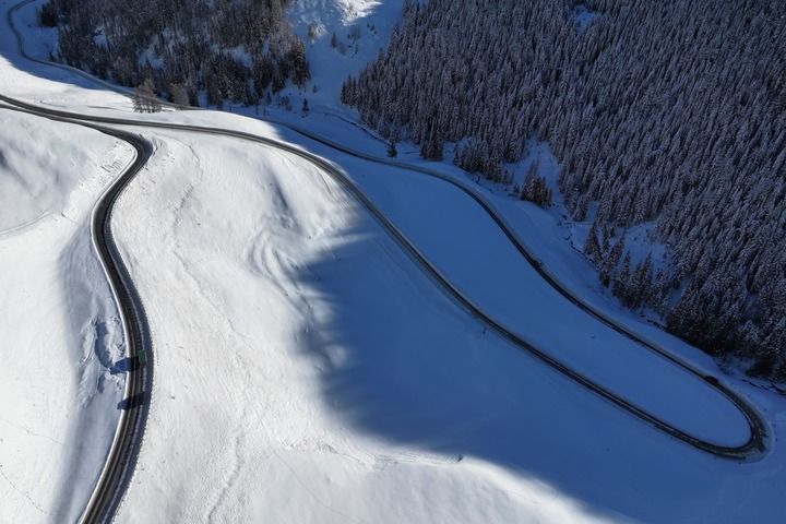木哈買提別克·木哈買提哈力前往禾木送郵件的路上,經過多個彎道。從布爾津前往禾木的郵路彎道眾多,冬季這裏雪崩頻發,路況危險(1月6日攝,無人機照片)。新華社發(加爾恆 攝)