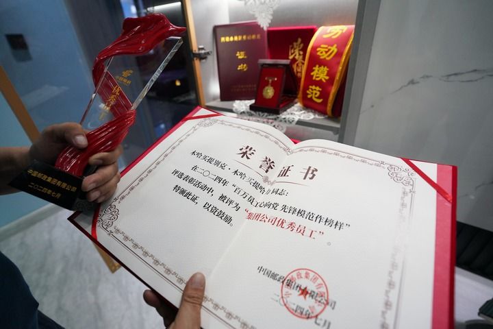 木哈買提別克·木哈買提哈力向記者展示中國郵政集團有限公司頒發給他的“集團公司優秀員工”證書(1月9日攝)。新華每日電訊記者 阿曼 攝