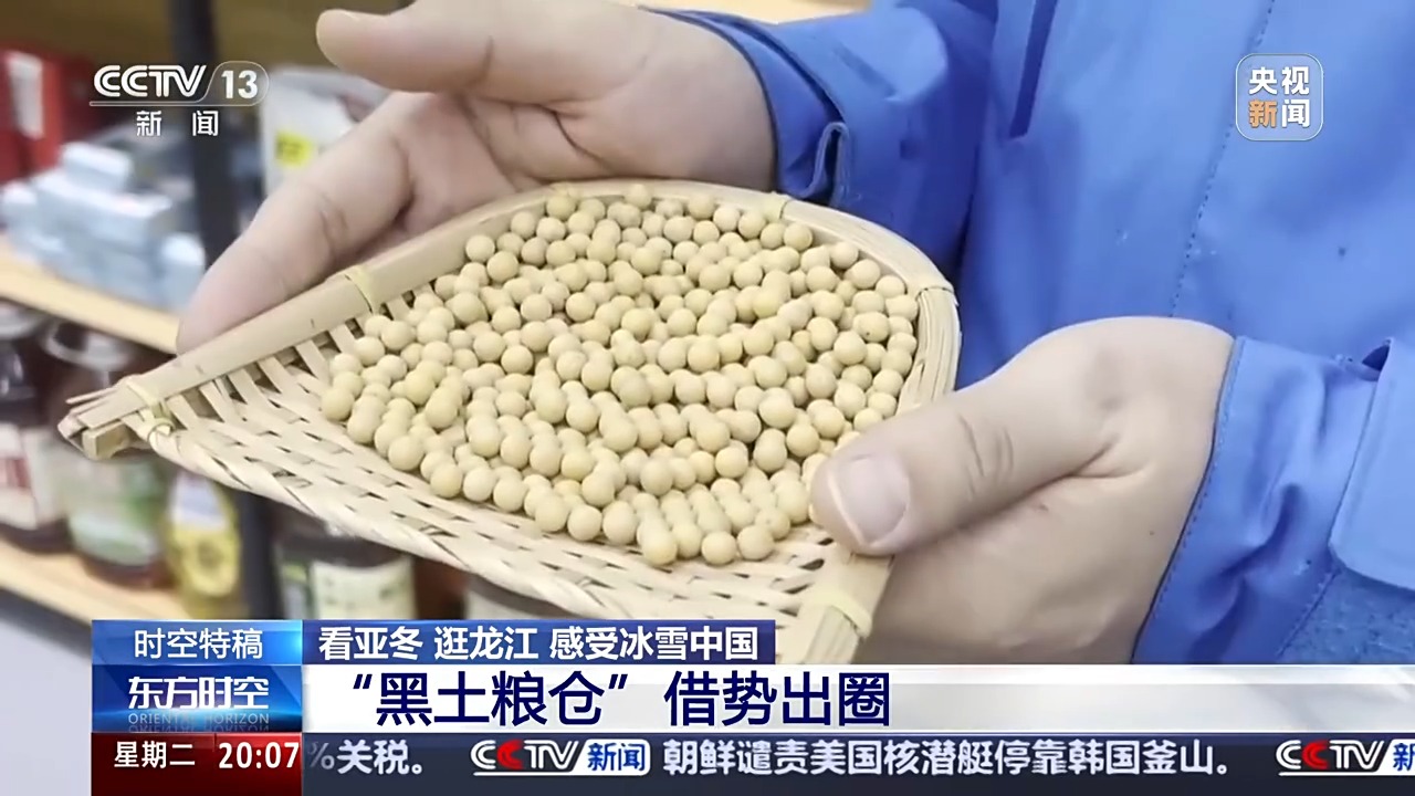 *總枱央視記者 鄭怡哲:*大家可以看到我手上拿的就是黑龍江當地產的大豆,它的種植面積和產量都是全國第一。單從種植面積上來講,黑龍江大豆的種植面積佔全國的60%左右。