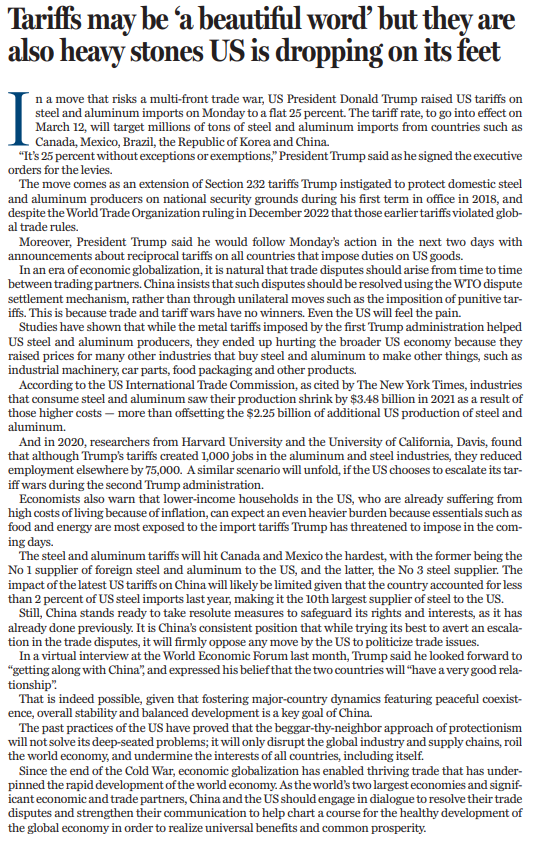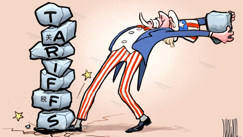貿易保護砸自己的腳。(來源:中國日報 羅傑 英文《中國日報》2025年2月12日8版)