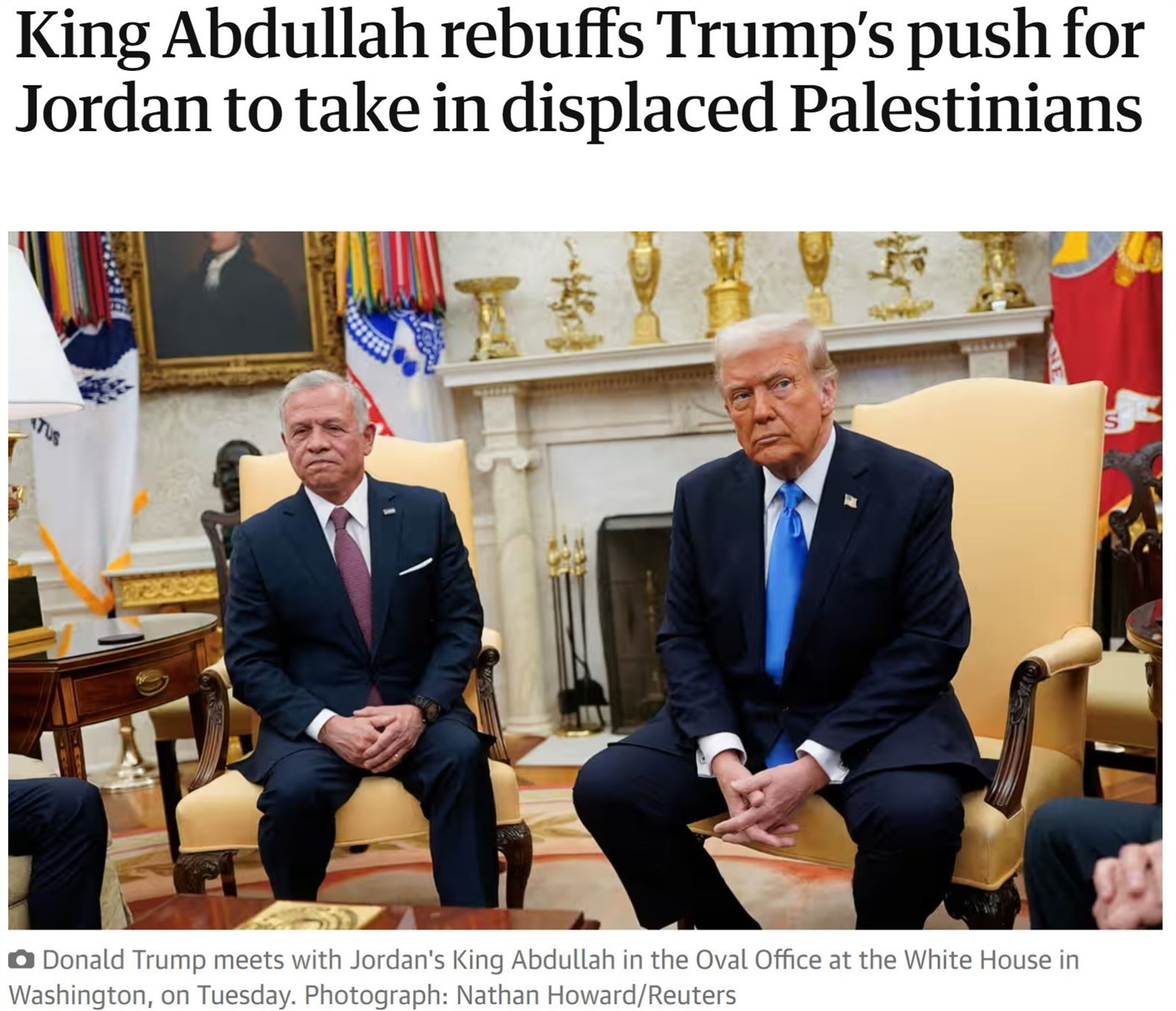 對於特朗普有關加沙地帶的最新表態,約旦國王阿卜杜拉二世回應稱,要等到與埃及等國共同商討後作出回應,他必須做對他的國家“最有利”的事情。