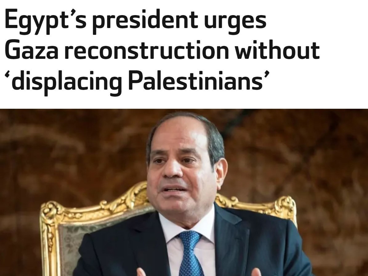 埃及總統辦公室發表聲明稱,埃及總統塞西在與丹麥首相弗雷澤裏克森通電話時表示,加沙地帶應該“在不驅逐巴勒斯坦人的情況下”進行重建,並確保維護他們在自己的土地上生活的權利。