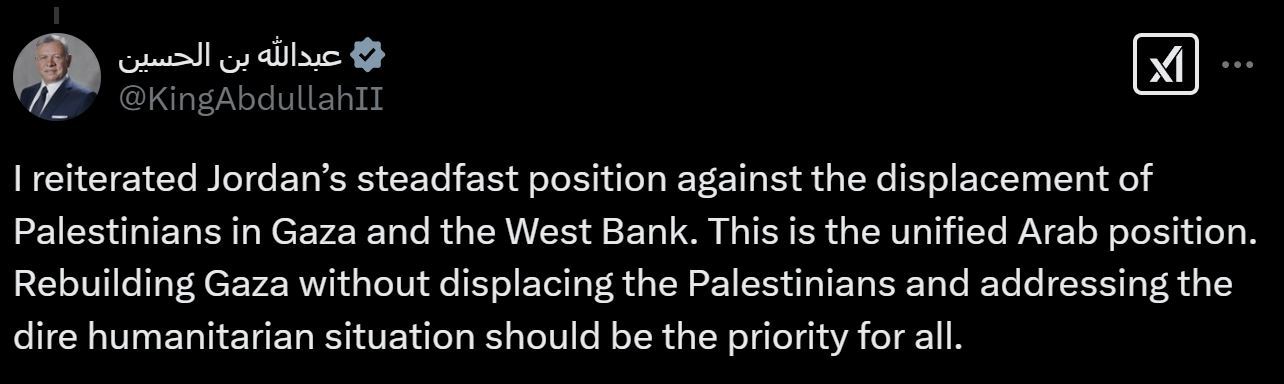 當天會晤後,阿卜杜拉二世在社交媒體上發文,重申了約旦反對巴勒斯坦人流離失所的堅定立場。他指出,這是阿拉伯人的統一立場,重建加沙而不讓加沙民眾流離失所,並解決嚴峻的人道主義危機應該是所有人的首要任務。