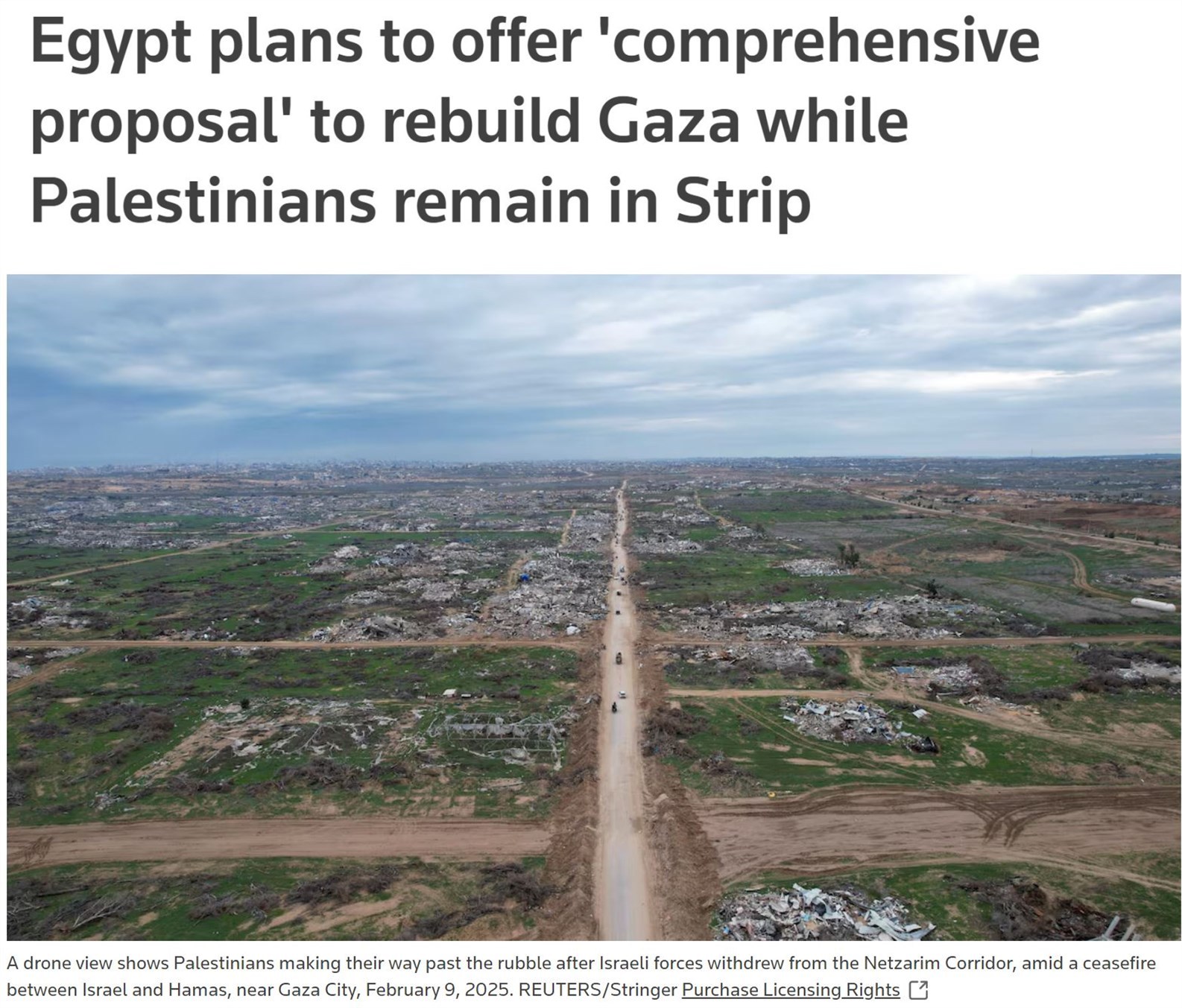 埃及外交部當晚還發表聲明稱,將於近期提出埃方關於重建加沙地帶的設想,該設想的基礎是讓巴勒斯坦人留在加沙地帶。
