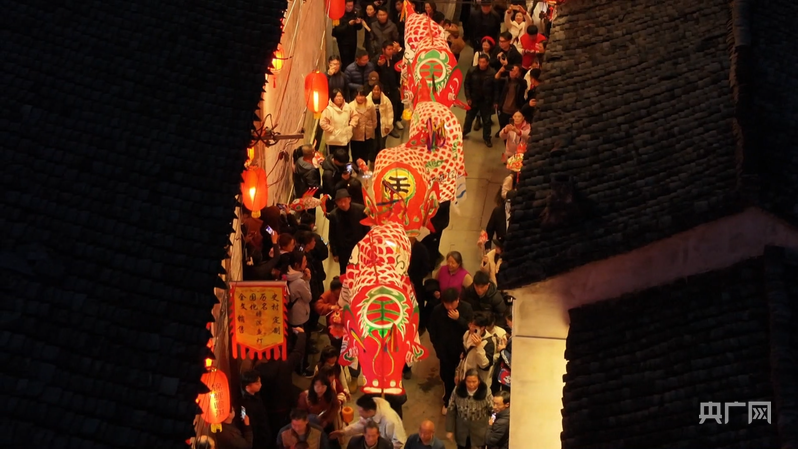 鳳簫聲動,玉壺光轉,一夜魚龍舞。夜幕降臨,魚燈亮起,照亮了天心堂、九世同堂、寧遠堂、裕德堂等百餘幢徽派傳統建築;每到一户人家,嬉魚燈隊伍都會放慢腳步,伴着熱烈的鑼鼓聲,把對新一年的期盼和祝福送入家家户户。瞻淇魚燈縣級代表性傳承人汪宇昉介紹,嬉魚燈表演一直到正月十八結束,正月十五之前村民舞紅色魚燈,寓意團圓吉祥;過了十五,就是青色魚燈登場的時候,象徵着萬象更新。