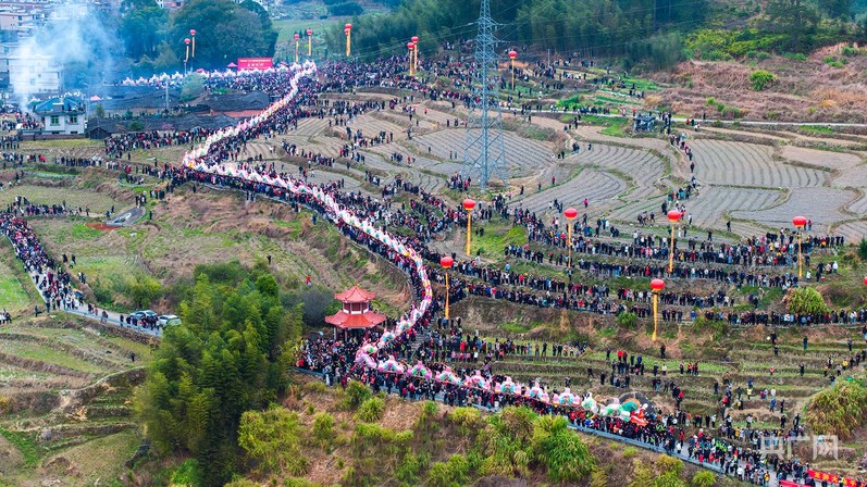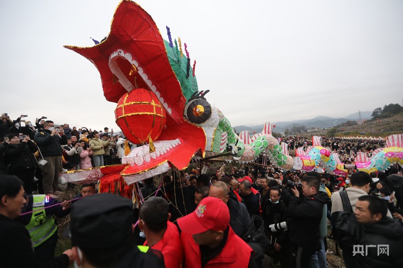 以竹為骨、宣紙為鱗,龍頭高逾3米,龍身綿延數百節……元宵節當天,夜幕降臨時,在福建省龍巖市連城縣姑田鎮,神銃轟鳴、鑼鼓喧天,數千名的當地中青年村民抬着數百米長的巨龍,在長長的彩旗隊、燈箱隊的引領下,蜿蜒於鄉間村野,穿行於大街小巷,騰挪起伏,活靈活現——這就是閩西客家元宵節慶姑田遊大龍活動。這項國家級非物質文化遺產代表性項目縣級代表性傳承人江修源介紹,這項活動始於明代,至今已有400多年曆史,意在祈求風調雨順、五穀豐登。