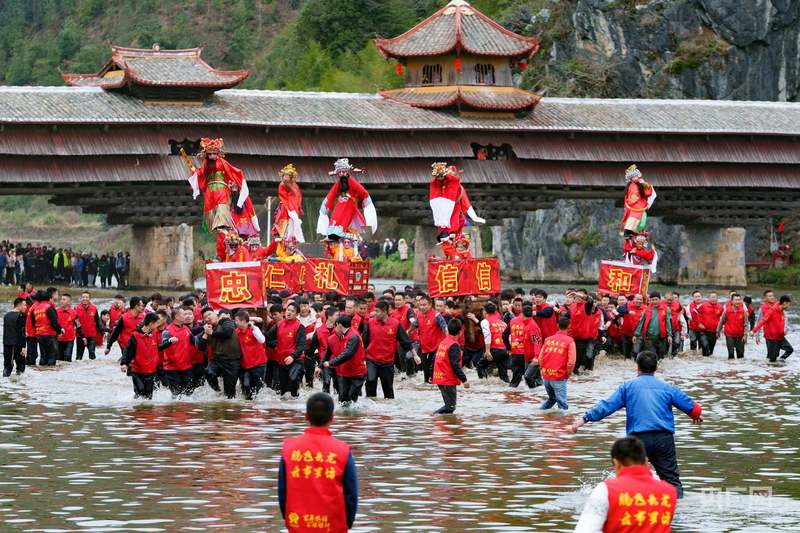 張世炎:所謂的“走古事”,就是大家抬着七個棚,也就是扮演古事的轎台,上面會站着戲曲裝扮、畫着臉譜的天官、武將等,不但要在岸上狂奔競速,更需在清巖河水中逆流爭渡,通過在水陸間奮勇爭先,展現先祖奮勇拼搏、力爭上游的創業精神,教育、激勵後人。這項活動也是中華體育文化優秀節慶項目,傳承至今已經二十八代了,大家抬起古事逆水狂奔,泥水飛濺、呼聲震天,你追我趕,非常熱鬧。