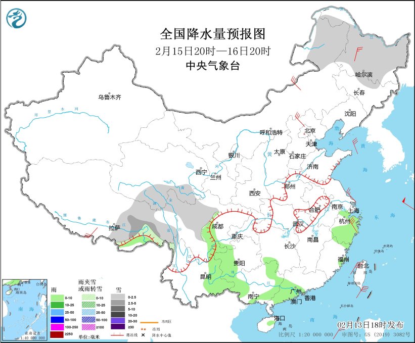 *2月13日20時至14日20時,*內蒙古東北部、新疆北部和南疆西部山區、西藏北部和東部、青海南部、甘肅東南部、川西高原北部、雲南西北部等地部分地區有小到中雪或雨夾雪,其中,西藏東南部局地有中到大雪(5~8毫米)。江淮西部、江漢大部、江南北部和西部、西南地區東部和南部、廣西西北部、海南島、台灣島等地部分地區有小到中雨。內蒙古西北部、西藏北部等地部分地區有4~6級風;台灣海峽、巴士海峽、南海東北部等海域有5~6級風(見圖1)。