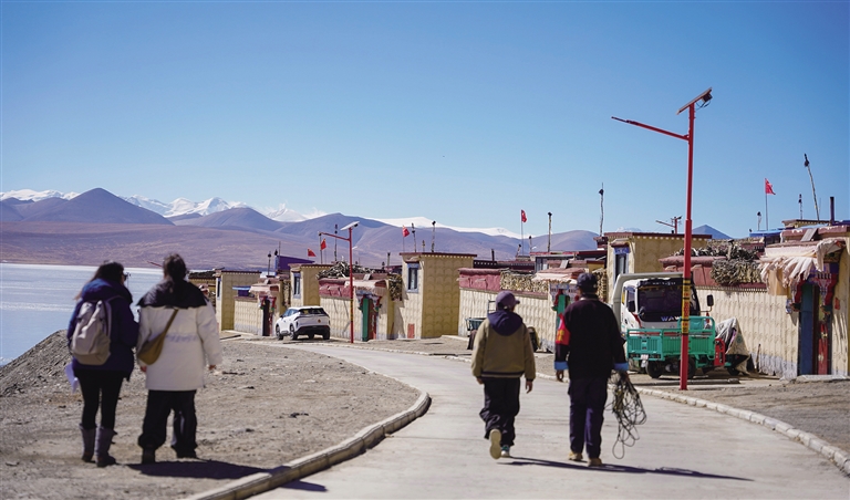 浪卡子縣打隆鎮推瓦村,南部與不丹接壤,邊界線長達25公里,是世界上海拔最高的純牧業行政村之一。全村共有40户人家,153位村民在此生活。2月6日,記者踏入推瓦村,首先映入眼簾的是遠處的普姆擁措湖,湖面在陽光的照耀下波光粼粼,與錯落有致的雪山相互映襯,構成一幅絕美的畫面。沿着平坦的柏油馬路前行,道路兩旁整齊排列的路燈和一排排以温馨黃色為主色調的邊境小康房格外引人注目。漫步在臨近冰湖的村路上,悠然愜意之感油然而生,雪山、湖泊、村落與村民們和諧相融,共同繪就了一幅寧靜祥和的鄉村畫卷。