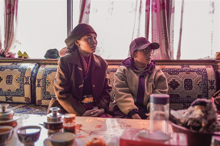 當日,天空晴朗,在廣袤無垠、無樹木遮擋的曠野上,稍起一陣疾風,便會揚起一層薄薄的黃沙。從村委會出發,沿着冰湖畔的水泥小路前行,很快就來到了村民倫珠曲珍的家。一進屋,厚實的木門便將凜冽的寒風擋在了門外。“快請進,這幾天風沙有點大,普莫雍措都沒以前藍了。”倫珠曲珍一邊關門一邊熱情地笑着説道。