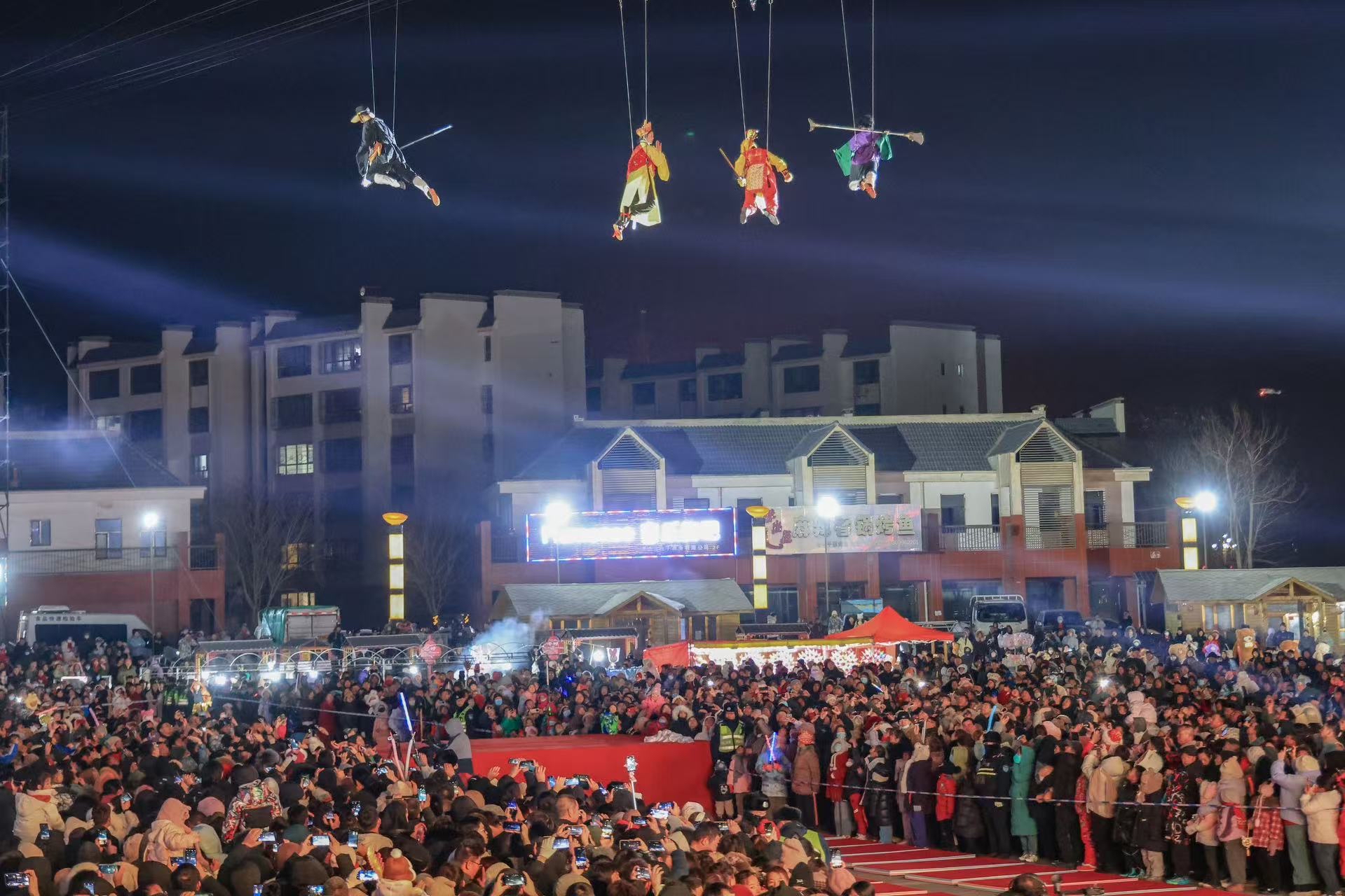 2月2日晚,2025“西遊西海·穿越博湖”高空威亞特技飛天音樂節在博湖縣舉行。年磊攝