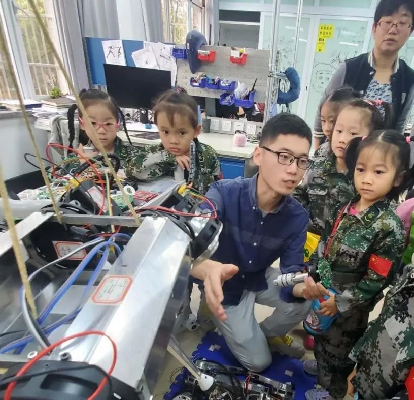 博士期間,金永斌為來訪實驗室的浙大幼兒園小朋友講解機器人知識。圖源浙江大學交叉力學中心官網