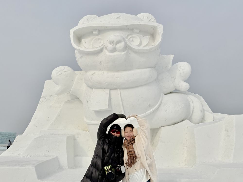 在哈爾濱冰雪大世界,來自台灣的“95後”遊客蔡湘庭正與亞冬會吉祥物“濱濱”“妮妮”的冰雕、雪雕合影。“來這裏正好趕上元宵節,紅彤彤的裝飾和熱情的人們,讓我覺得非常友好。”她説。