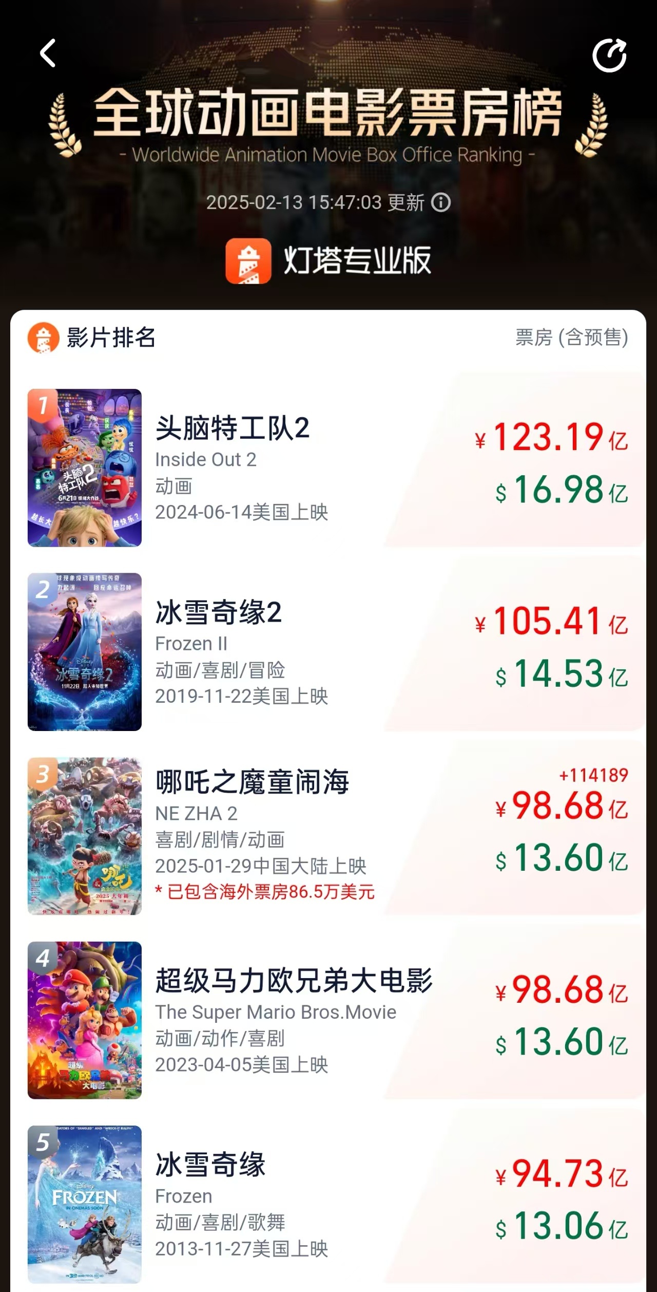 影片《哪吒之魔童鬧海》全球票房(含預售)