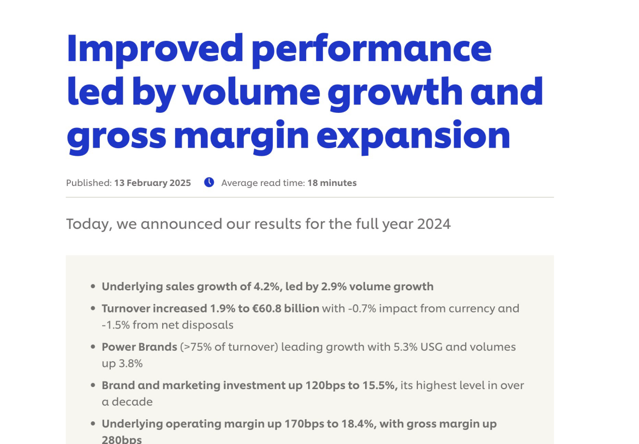 根據聯合利華2月13日公佈的第四季度業績報告顯示,其基本銷售額增長 4%,低於分析師預測的 4.1%。由於短期內市場增長低迷,2025 年的開局將會比較緩慢,該公司預測 2025 年的基本銷售額增長率將在 3%~5% 的範圍內。
