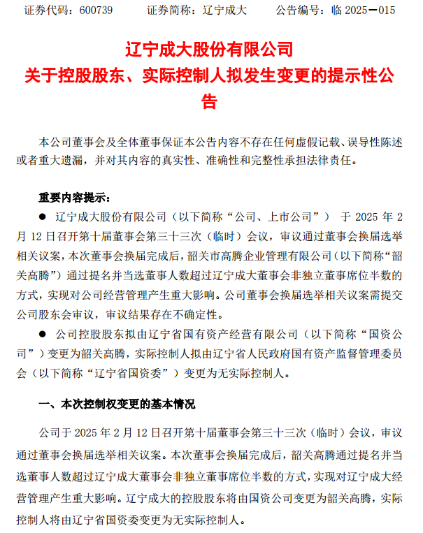 值得注意的是,遼寧成大自身也經歷了股權結構的變化。公司控股股東將由遼寧國資公司變更為粵民投旗下的韶關高騰,實際控制人將從遼寧省國資委變更為無實際控制人。這一變更發生在遼寧成大董事會換屆之後,粵民投通過提名並當選董事的方式,對遼寧成大的經營管理產生了重大影響。