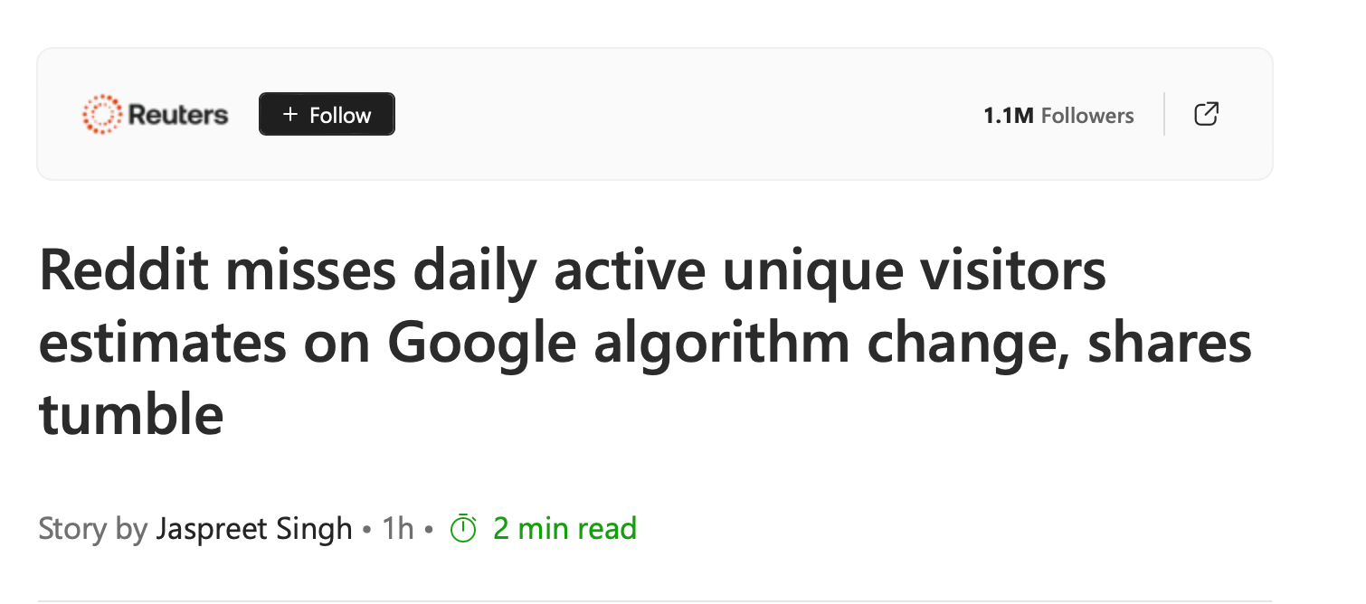【環球網財經綜合報道】2月13日消息,據路透社報道,Reddit在週三公佈的第四季度財報顯示,其日均活躍獨立訪問者數量為1.017億,低於市場預期的1.033億。這一結果受到谷歌搜索算法變化的顯著影響,導致Reddit在搜索結果中的出現頻率下降,進而影響了用户增長。