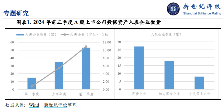 據新世紀評級報告顯示,截至2024年9月末,共有53家A股上市公司實現數據資產入表,入表國有企業和民營企業數量相當,呈現出較顯著增長態勢,但入表金額相較於資產總額仍 很低,上述入表上市公司的數據資產總額佔資產總額的比重僅0.02%。