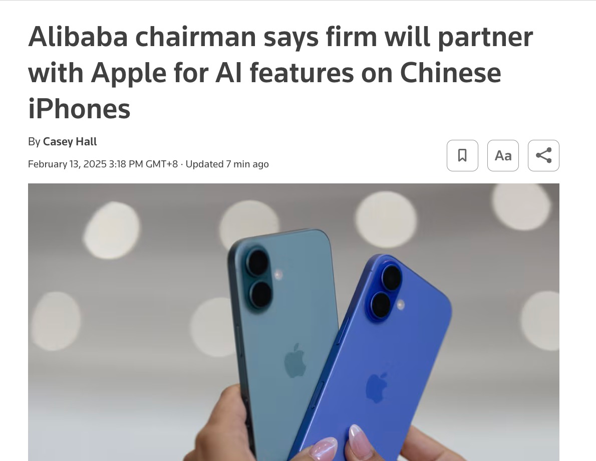 【環球網科技報道 記者 李文瑤】2月13日,據路透社等外媒消息,在阿聯酋迪拜舉辦的World Governments Summit 2025峯會上,阿里巴巴聯合創始人、董事局主席蔡崇信確認了阿里與蘋果合作傳聞,他表示,蘋果在中國需要一個本地化的合作伙伴,為他們的手機服務。